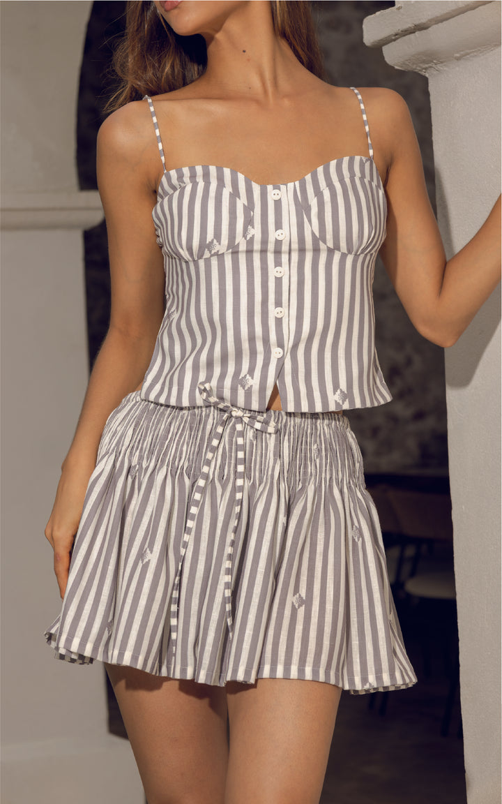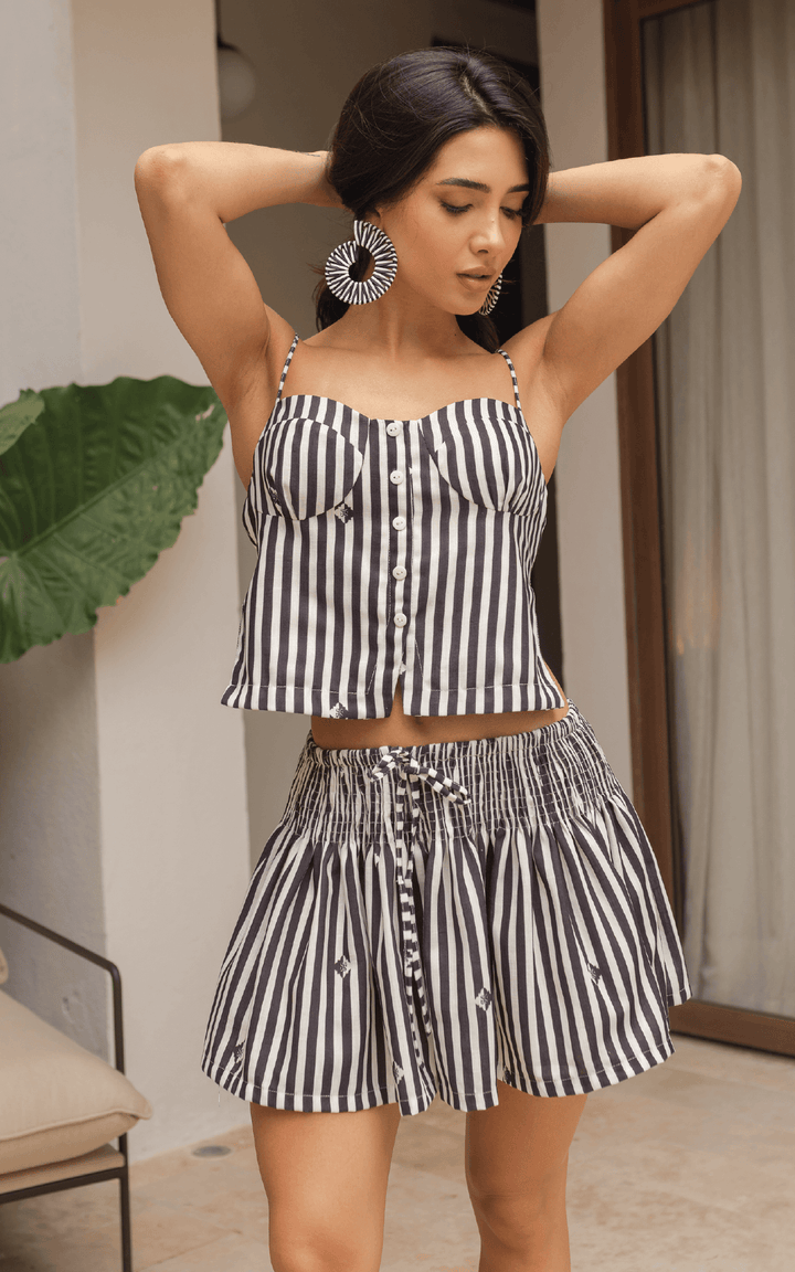 PERFECTA PARA HACER MATCH CON EL SHORT THE PRINT!!!! es una prenda fresca, versátil y con mucho estilo. Diseñado con un estampado de rayas verticales que estiliza la figura y detalles gráficos sutiles, este short se convierte en el básico statement de cualquier look veraniego.