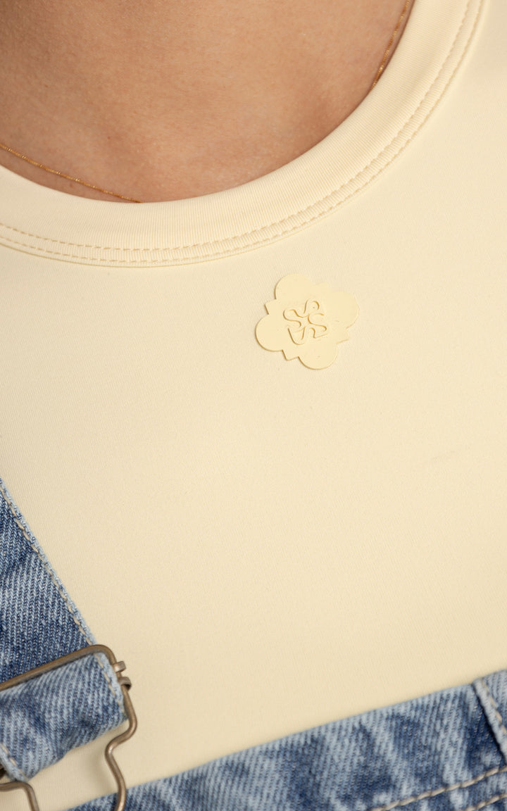 Diseño: Silueta ajustada con cuello redondo, manga corta y Aplique decorativo en forma de flor con logo al centro.