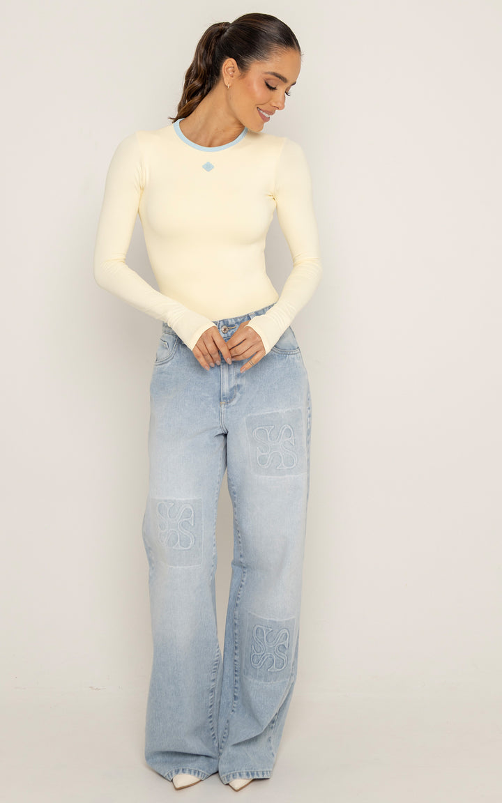 - Diseño: Body con cuello en "U", aplique en alta densidad en la parte del cuello y mangas largas con efecto tipo guante.