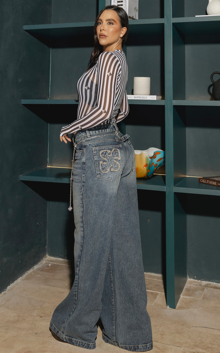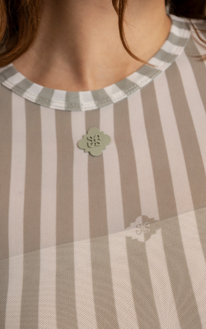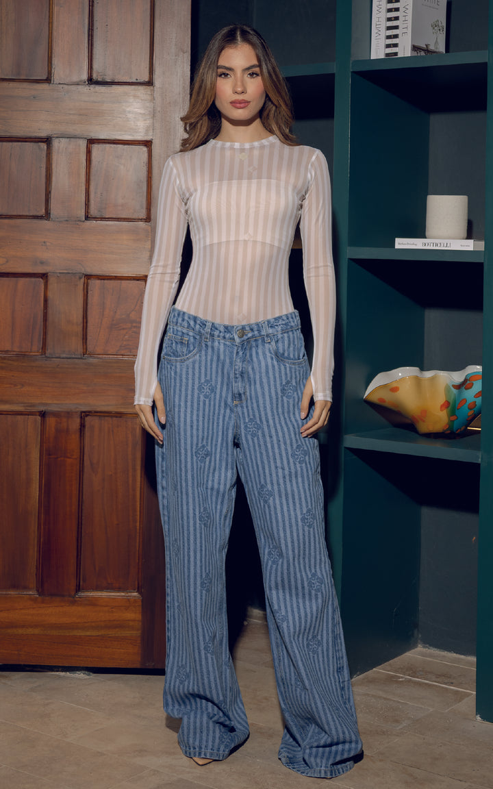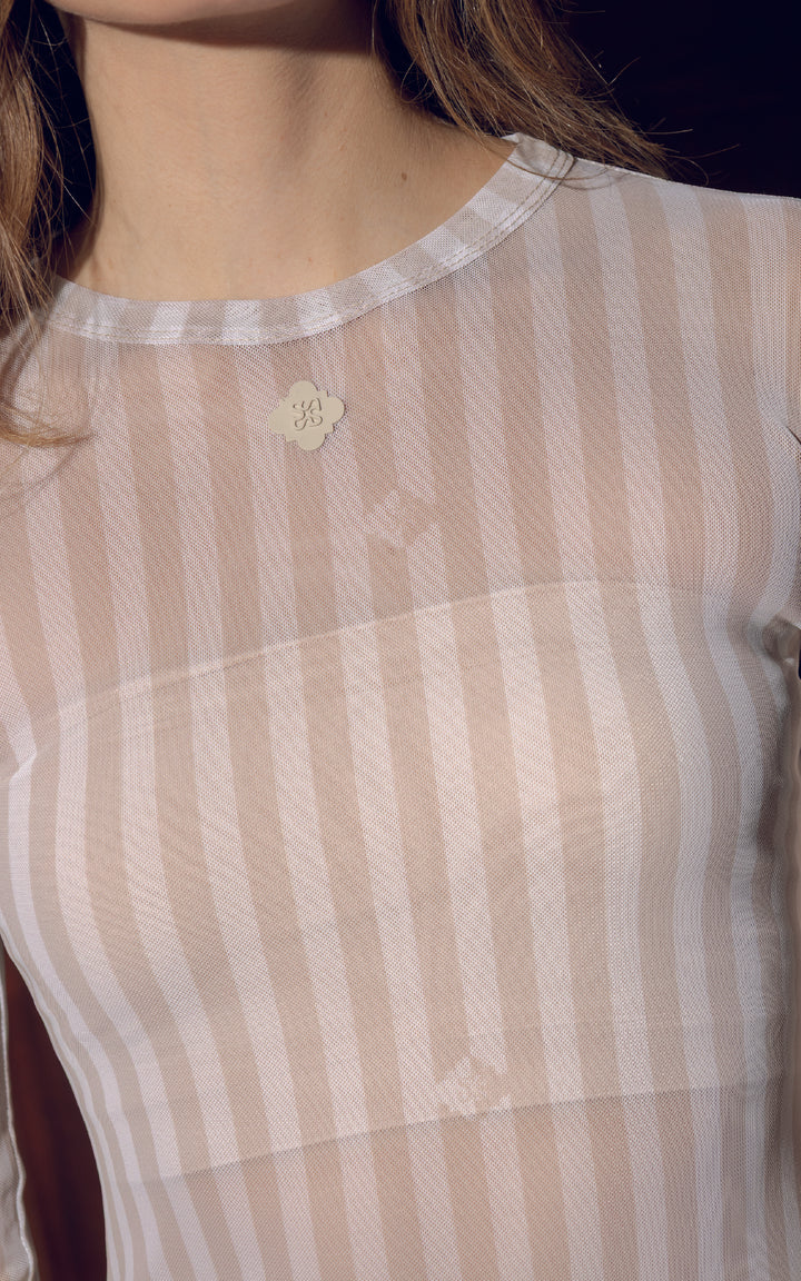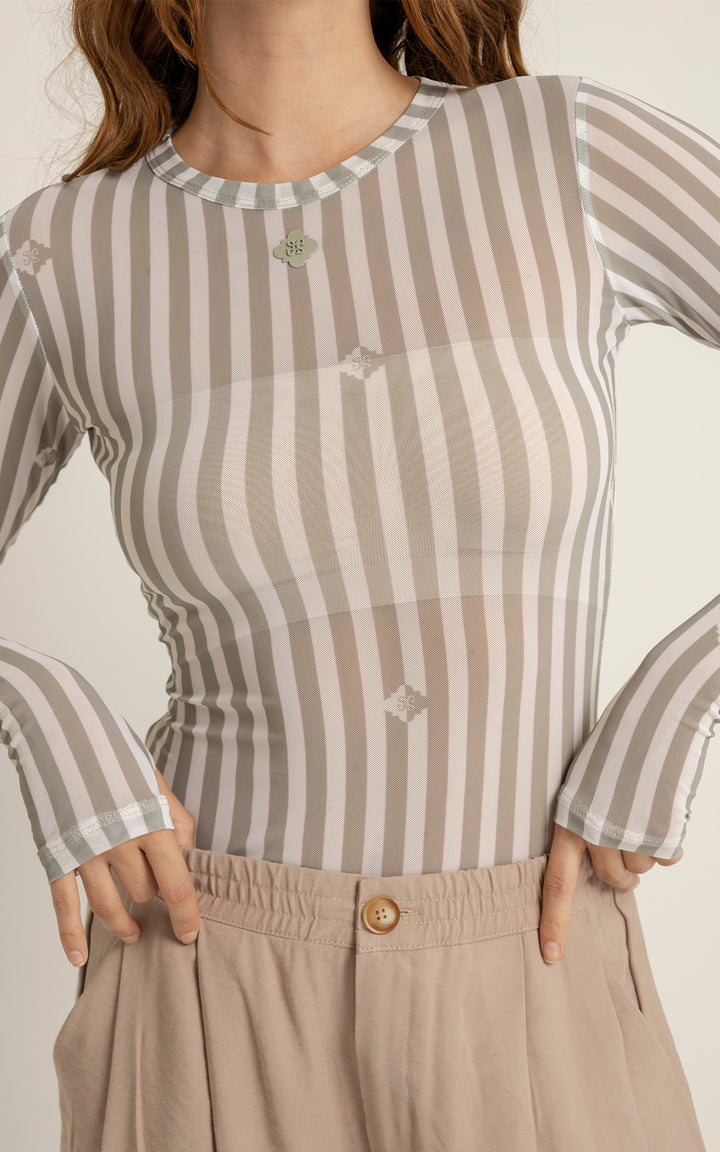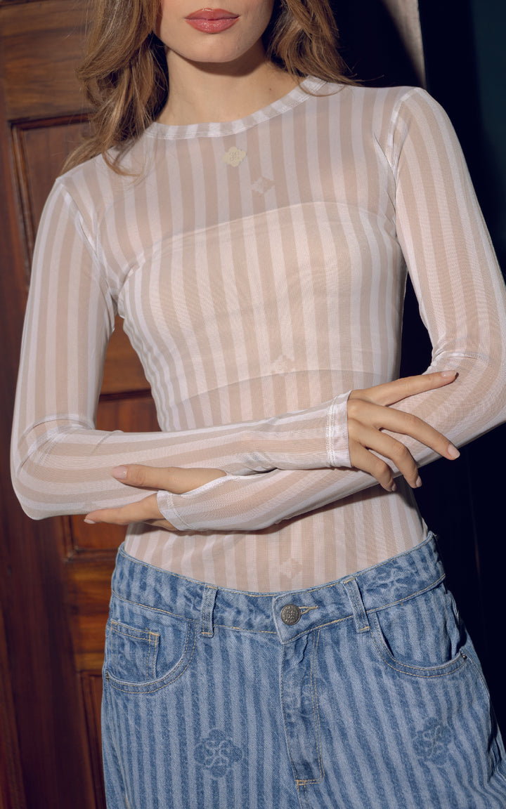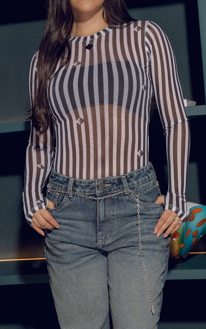 Body de manga larga en mesh, una prenda versátil , ideal para elevar cualquier look. Suss lineas verticales estilizan la silueta, mientras que su escote cerrado lo hace sofisticado y versátil.
