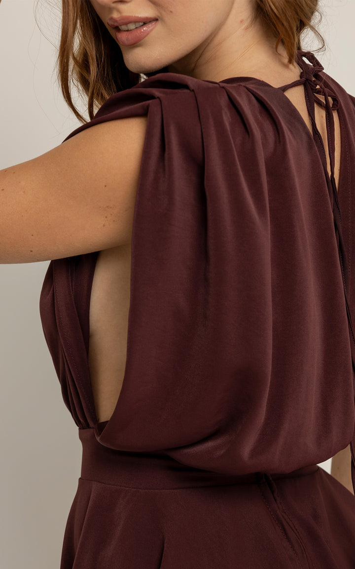 La parte posterior presenta un escote en V que se ajusta con delicadas tiras al cuello y a la cintura, permitiendo graduar el fit y adaptarlo al cuerpo. Su falda con vuelo tipo pareo oculta el short interior, brindando comodidad y libertad en cada paso.