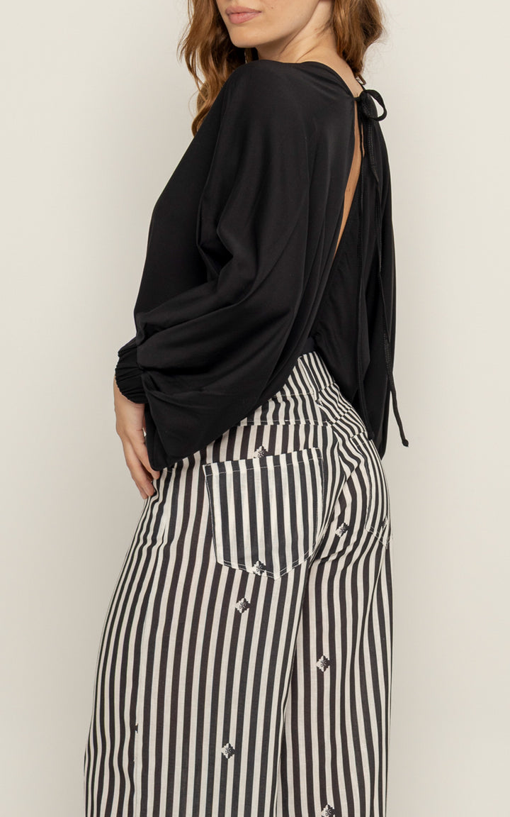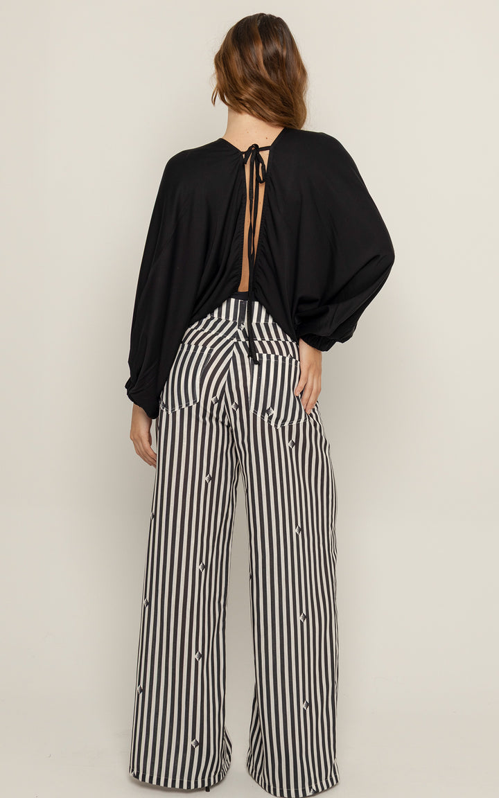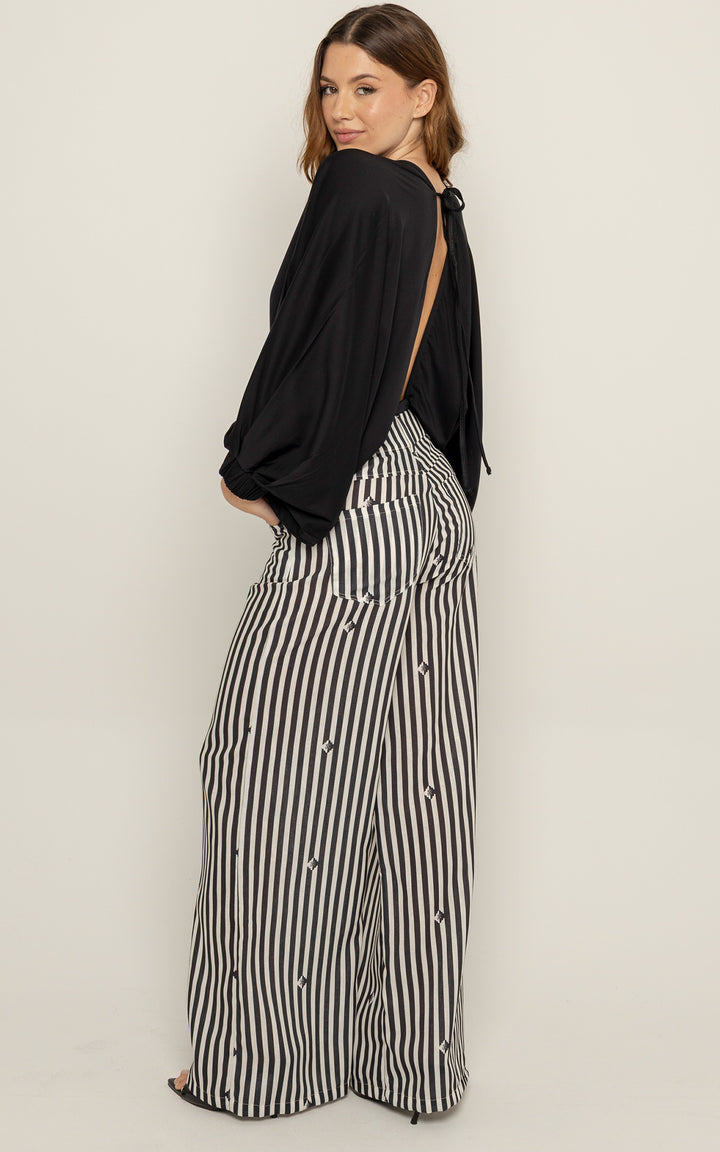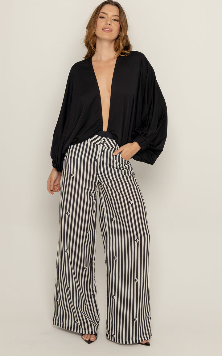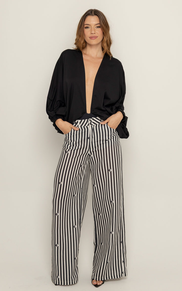 Su diseño tipo palazzo de tiro alto alarga la figura y aporta un movimiento fluido y sofisticado al caminar. Es ideal tanto para propuestas casuales como para looks más pulidos si se combina con tacones y accesorios dorados.
