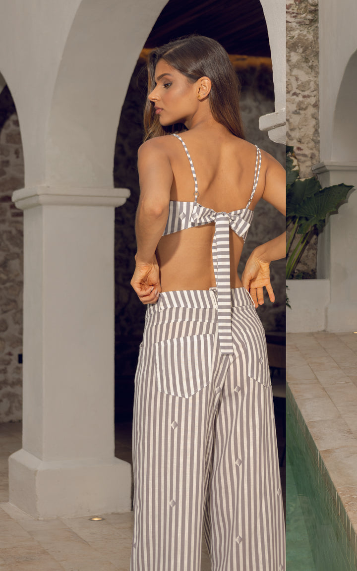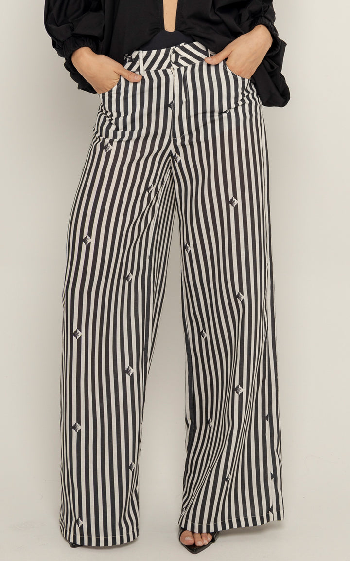 Pantalón en poliéster, sublimado con patrón de rayas y logotipo de la marca, las rayas son una tendencia indiscutible en esta temporada. El Pantalón The Subli combina la frescura del verano con una silueta elegante y favorecedora. Confeccionado en una tela liviana de rayas verticales con bordados decorativos, es una prenda que estiliza visualmente y se adapta con facilidad a climas cálidos.
