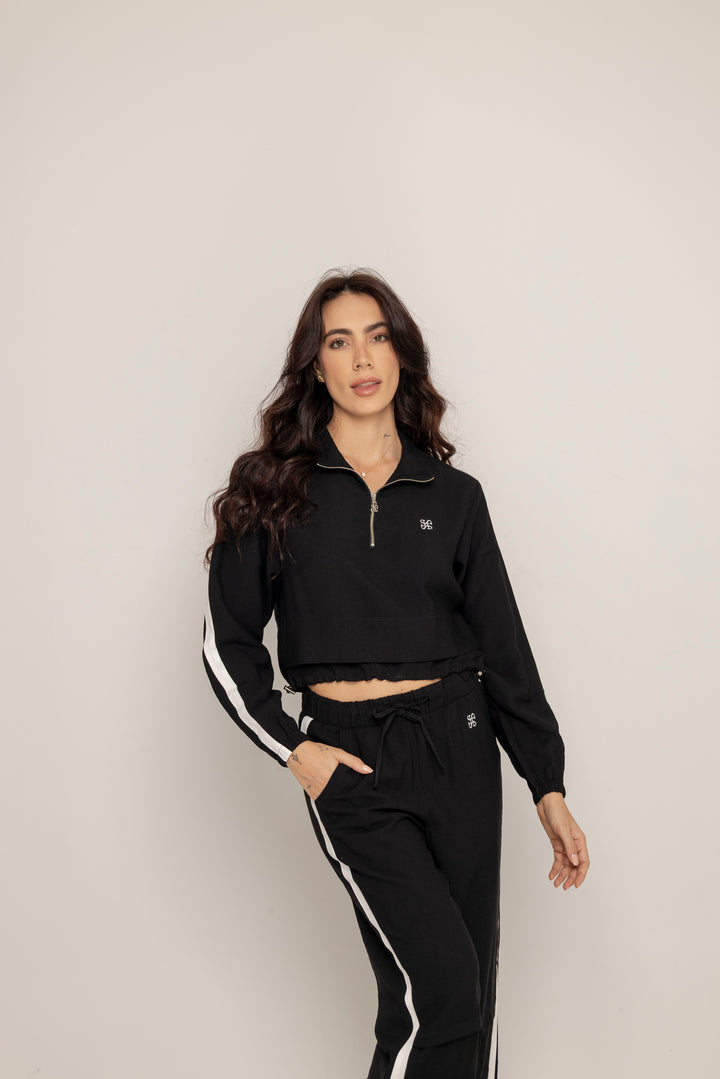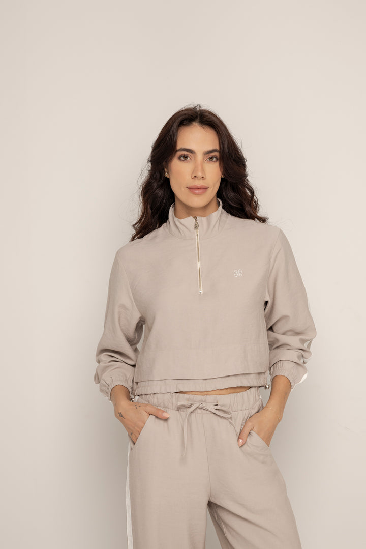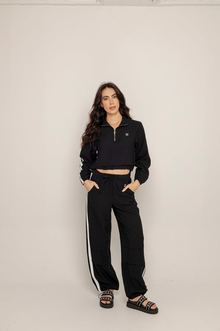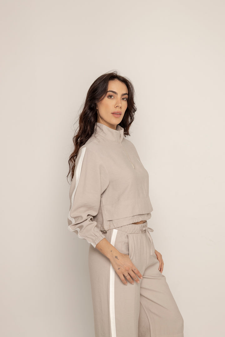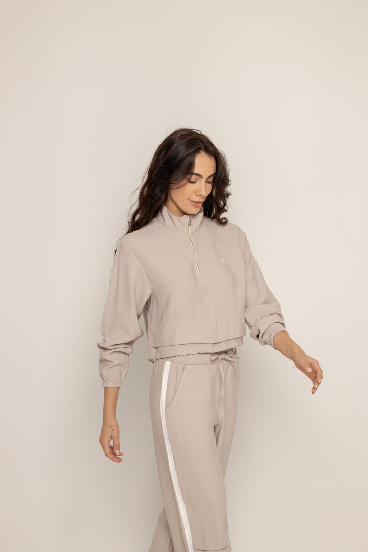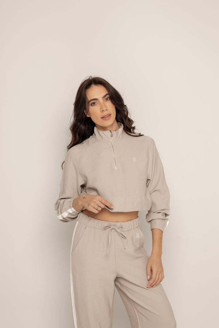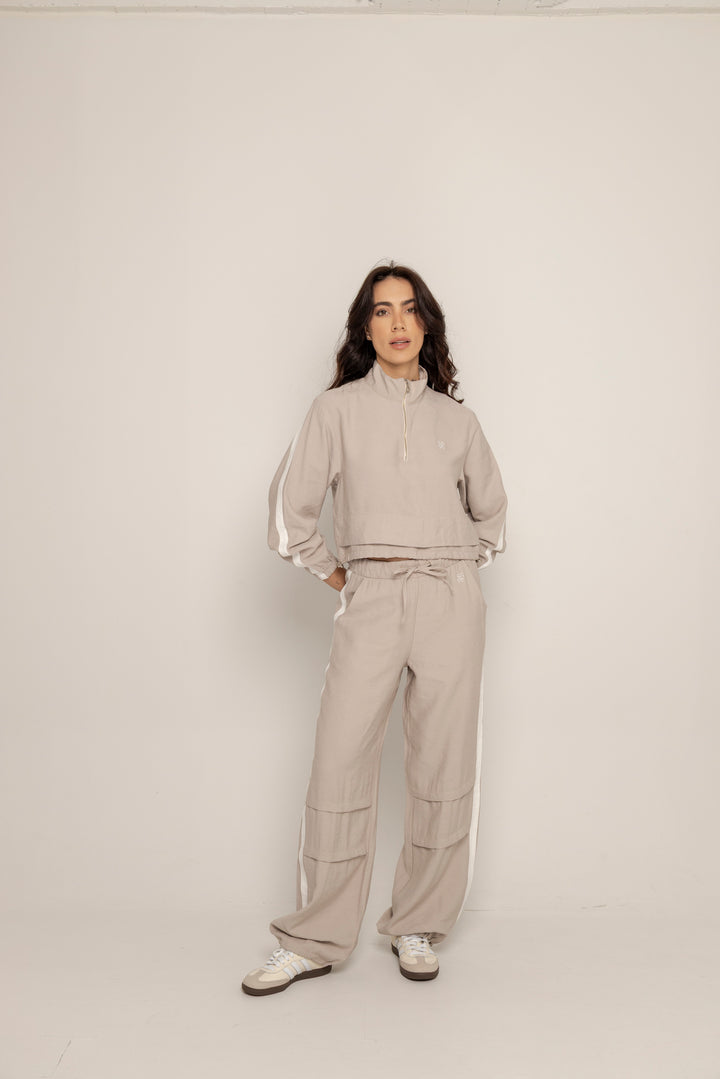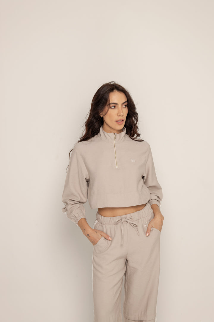 El Set Benni está confeccionado en tejido liviano tipo punto, con tacto suave y caída fluida. Está compuesto por dos piezas: un buzo tipo cropped con cierre frontal hasta el pecho, cuello alto y hombros caídos; y un pantalón de silueta recta con pretina elástica ajustable, bolsillos laterales y detalles de pespuntes que segmentan la pierna en bloques.