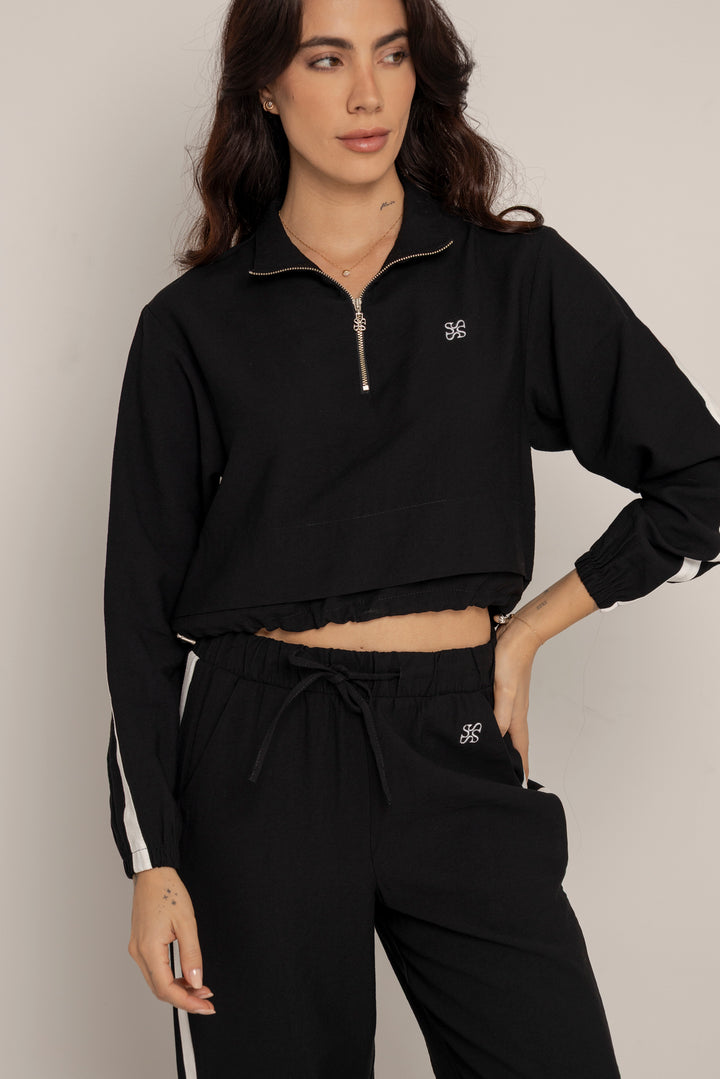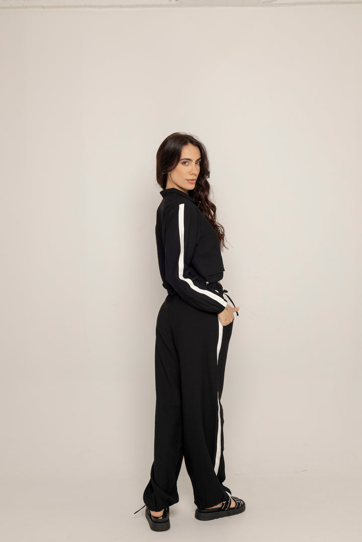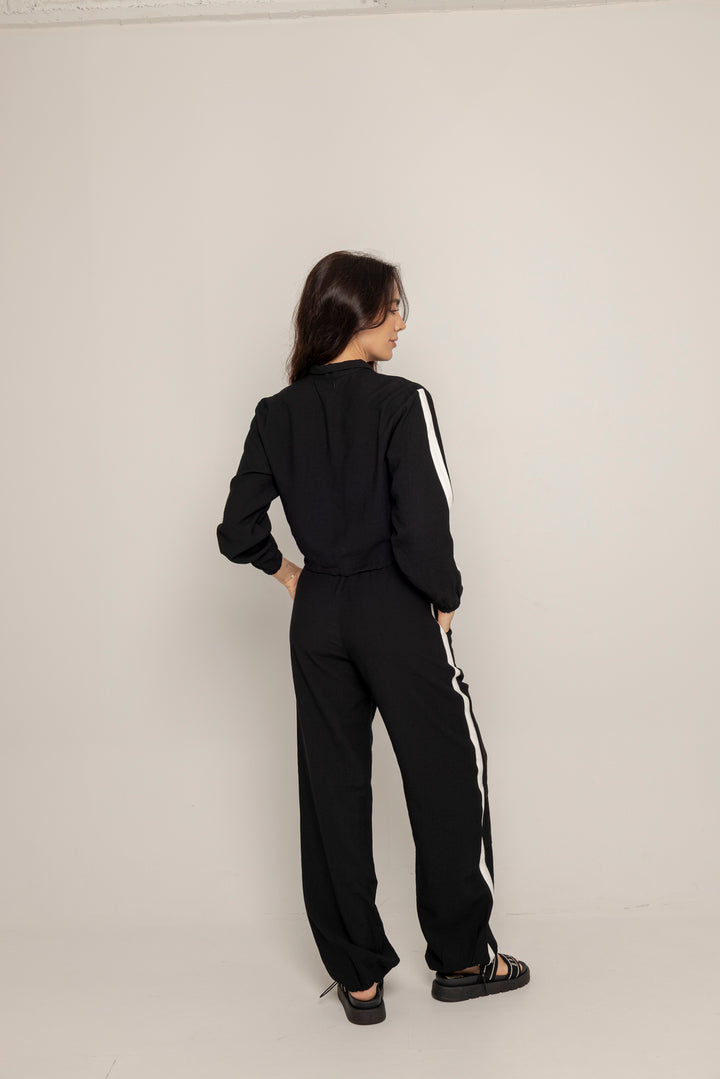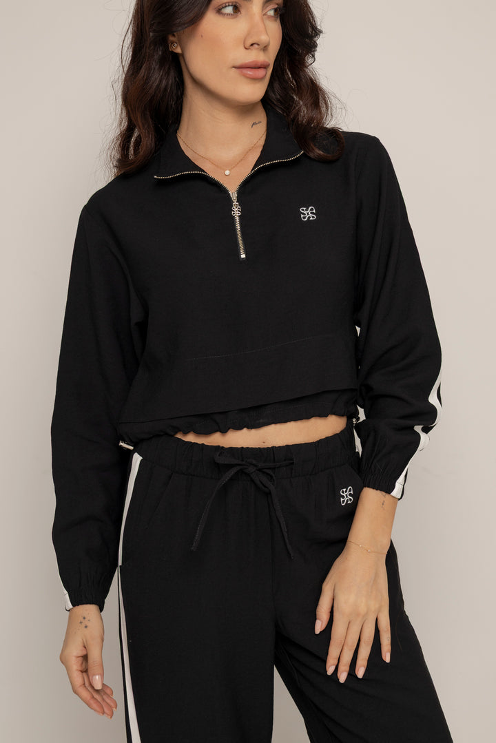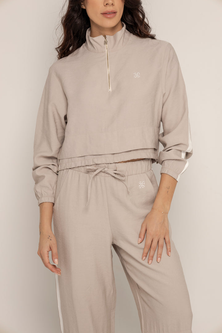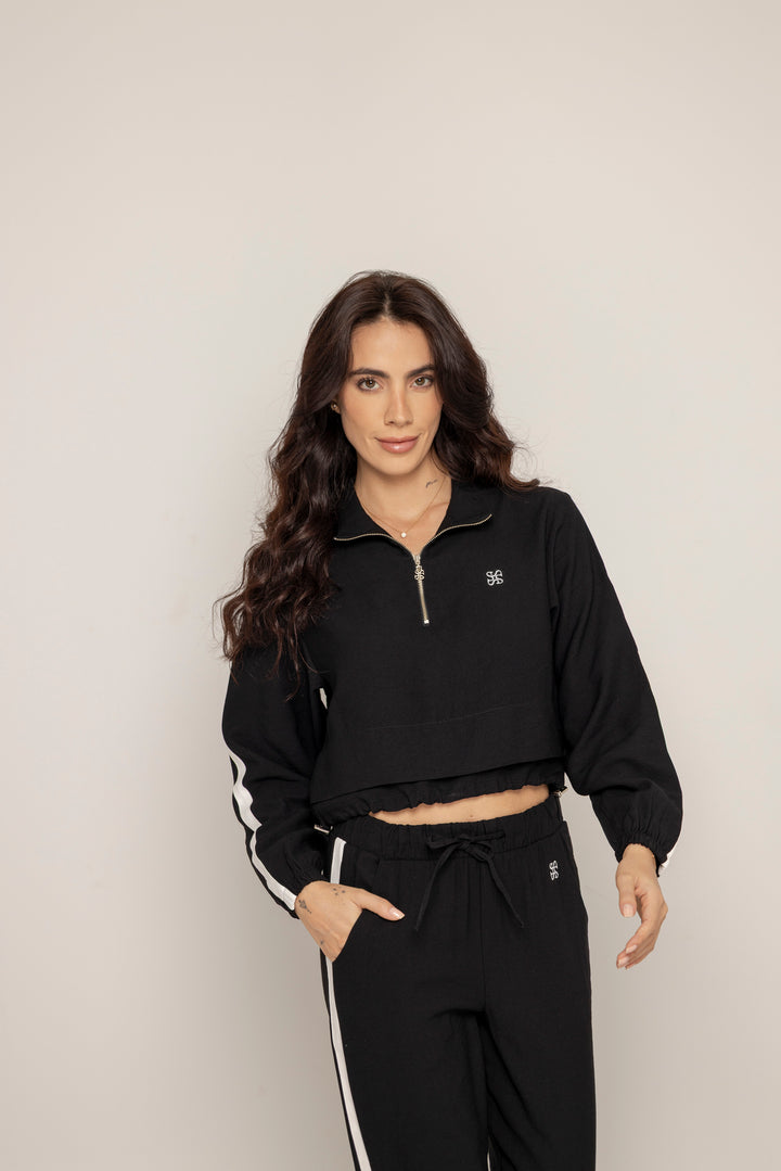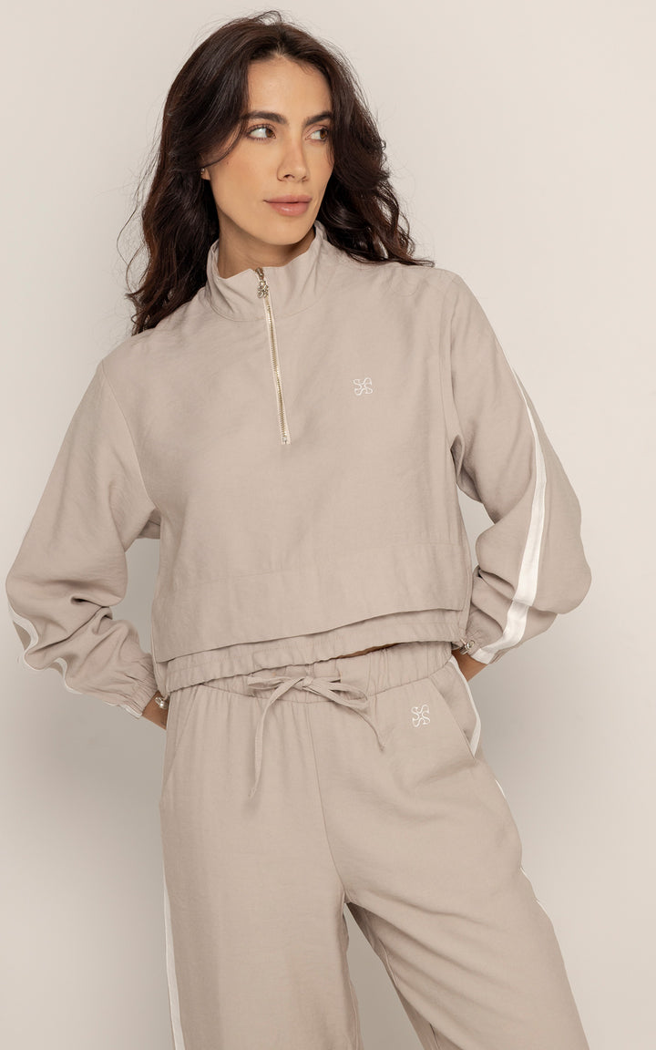 El Set Benni está confeccionado en tejido liviano tipo punto, con tacto suave y caída fluida. Está compuesto por dos piezas: un buzo tipo cropped con cierre frontal hasta el pecho, cuello alto y hombros caídos; y un pantalón de silueta recta con pretina elástica ajustable, bolsillos laterales y detalles de pespuntes que segmentan la pierna en bloques.
