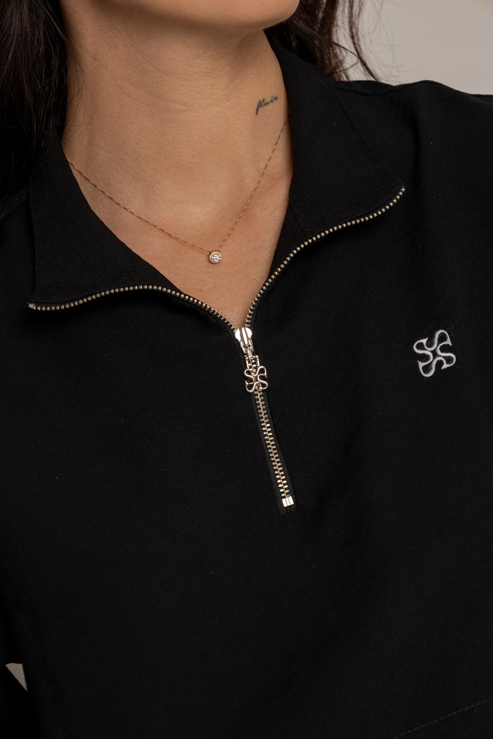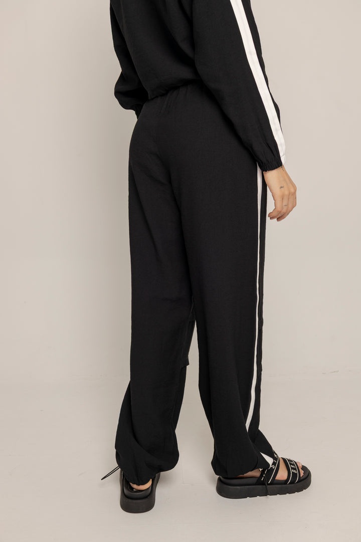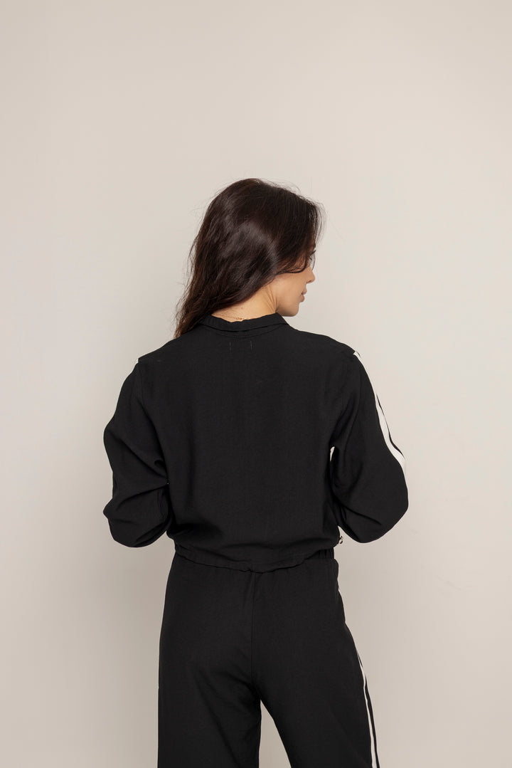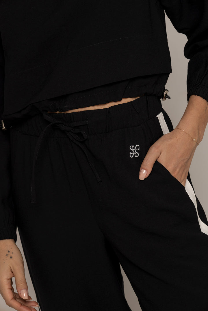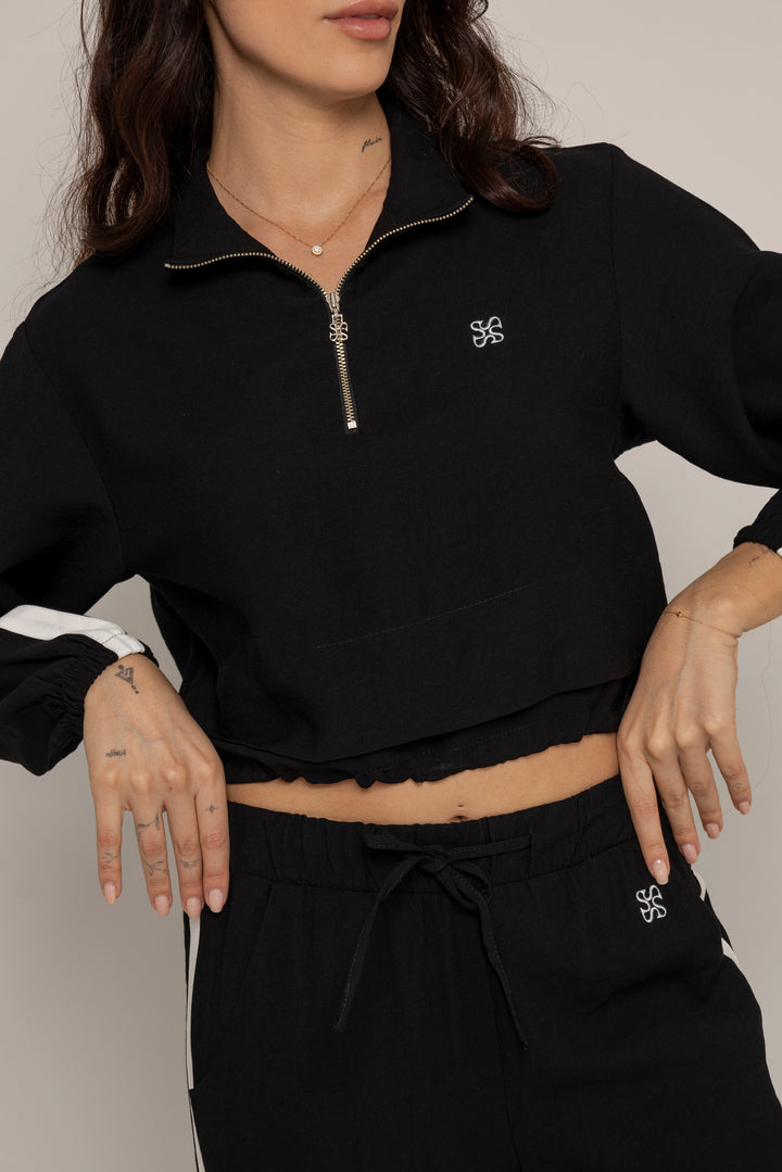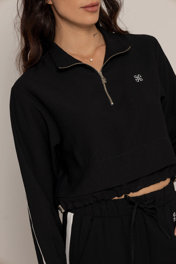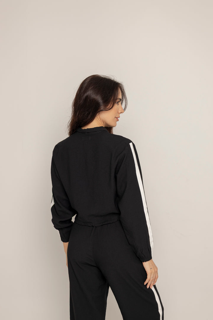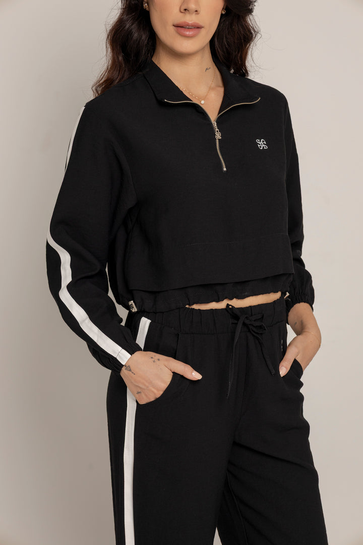 El Set Benni está confeccionado en tejido liviano tipo punto, con tacto suave y caída fluida. Está compuesto por dos piezas: un buzo tipo cropped con cierre frontal hasta el pecho, cuello alto y hombros caídos; y un pantalón de silueta recta con pretina elástica ajustable, bolsillos laterales y detalles de pespuntes que segmentan la pierna en bloques.