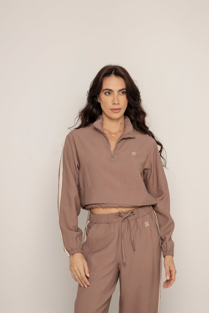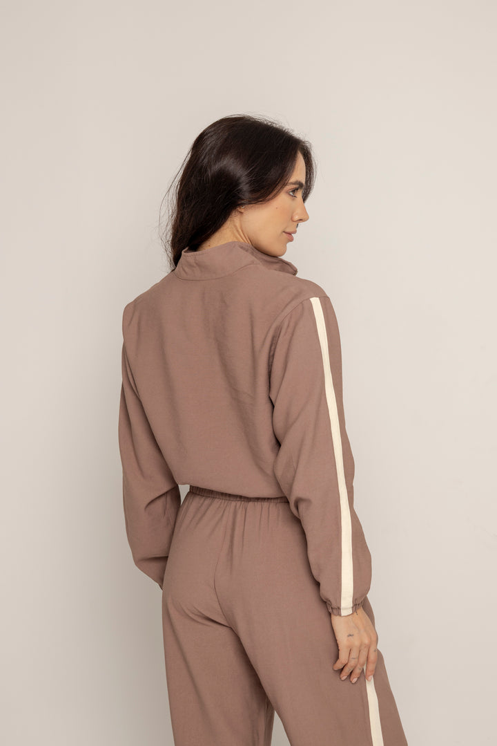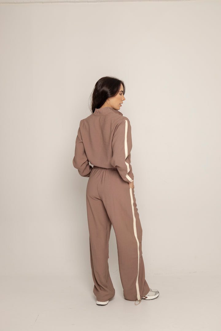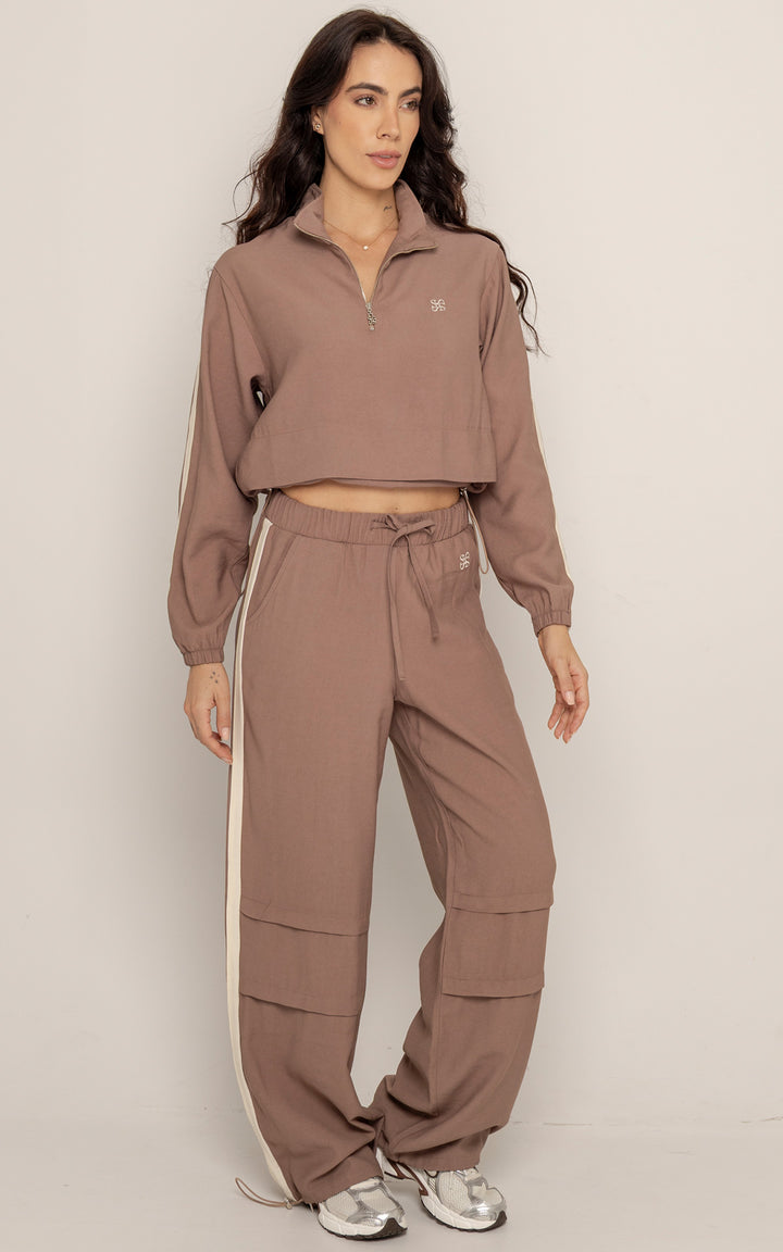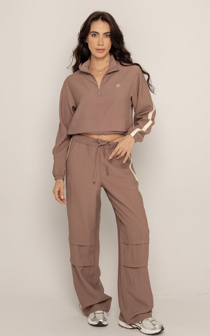 Ambas piezas incluyen líneas laterales en contraste y el logo bordado en el mismo tono, aportando un aire deportivo con enfoque estético. El color tierra suave le da calidez y versatilidad a la prenda, ideal para usar juntas o por separado.