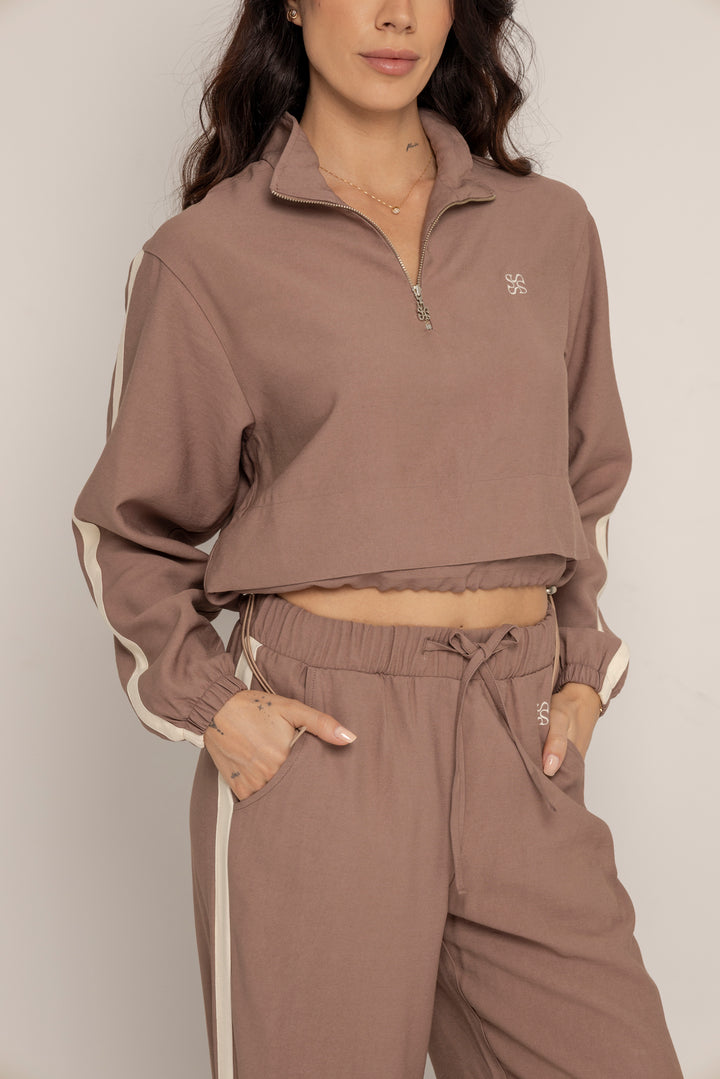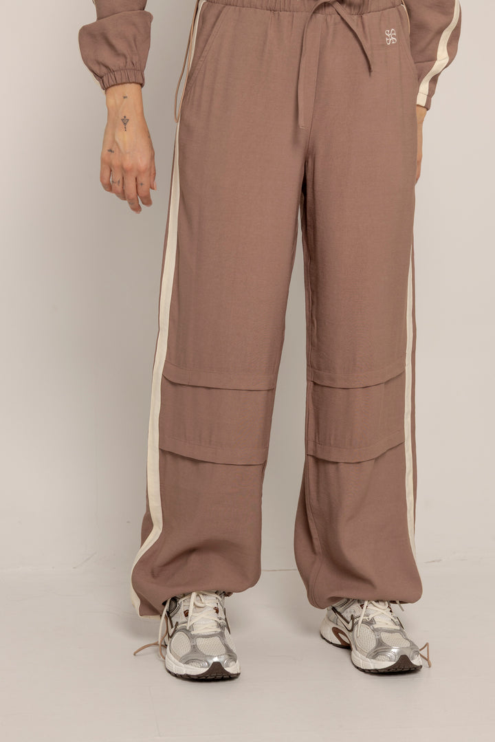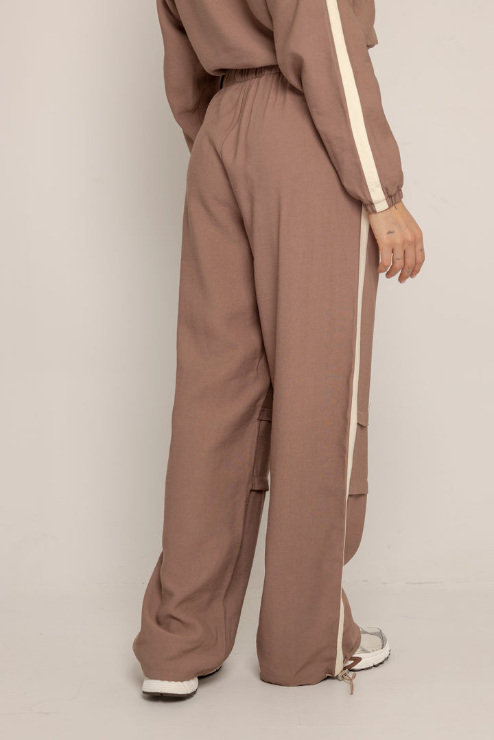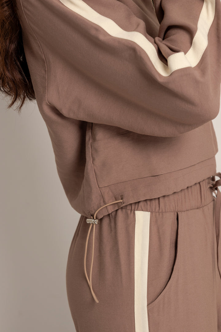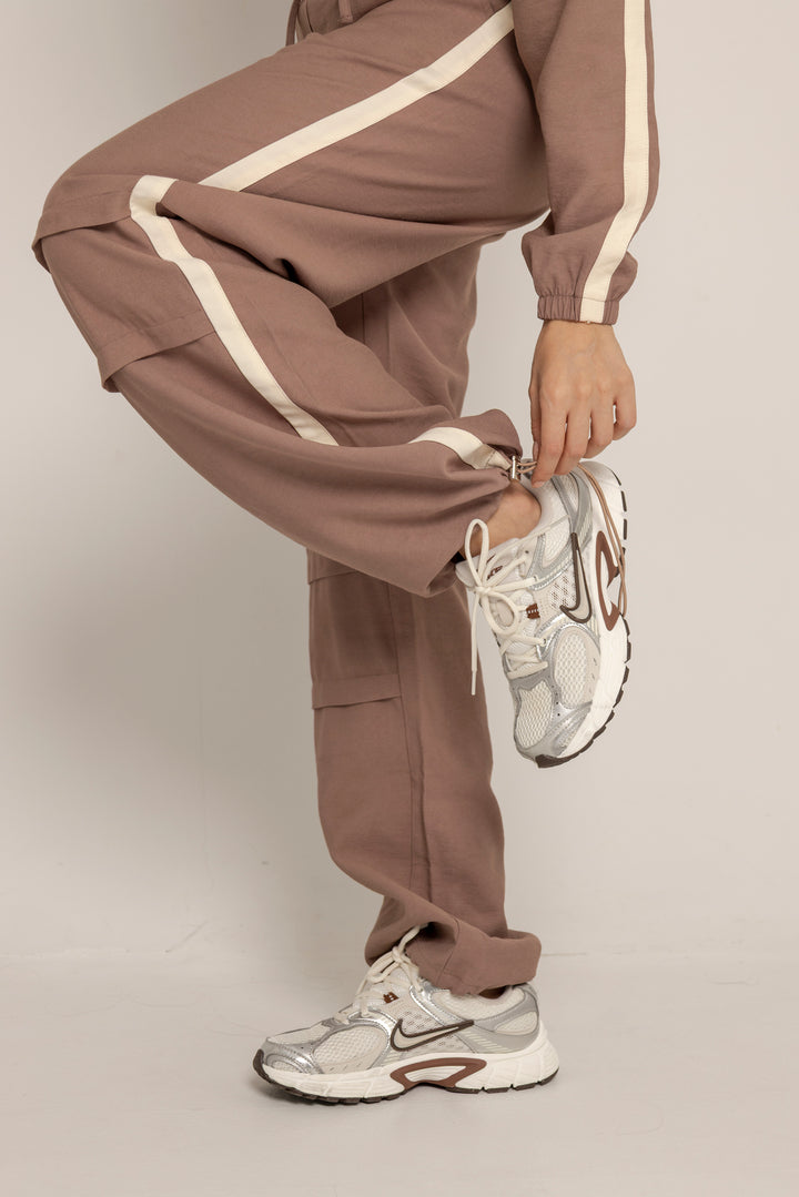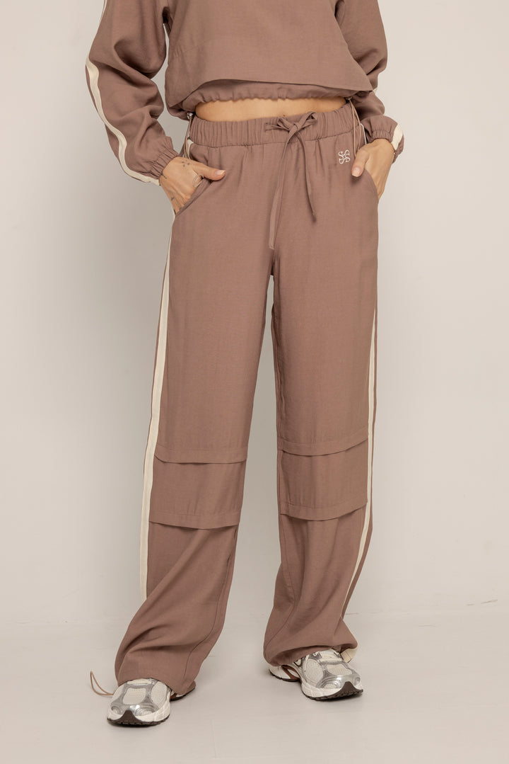 Ambas piezas incluyen líneas laterales en contraste y el logo bordado en el mismo tono, aportando un aire deportivo con enfoque estético. El color tierra suave le da calidez y versatilidad a la prenda, ideal para usar juntas o por separado.