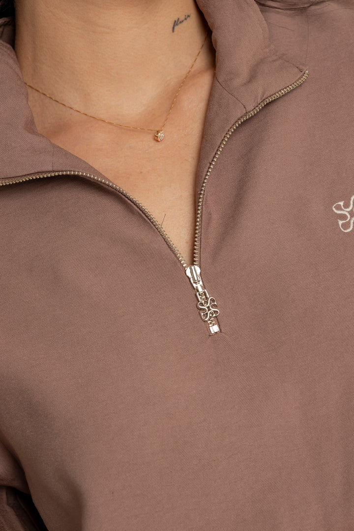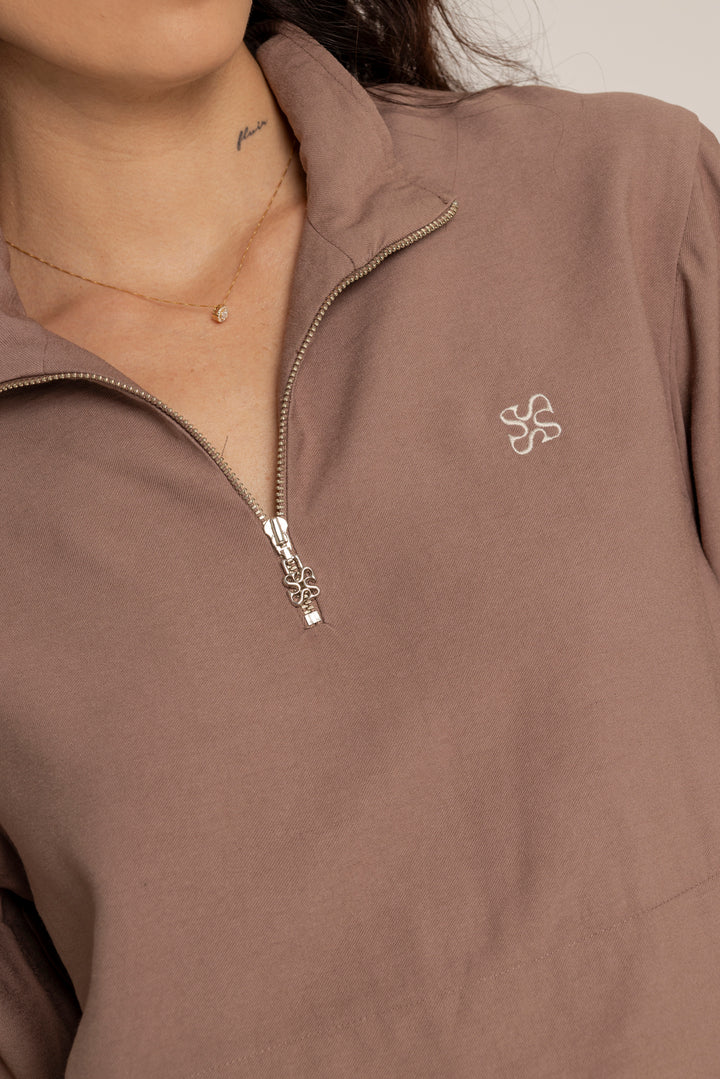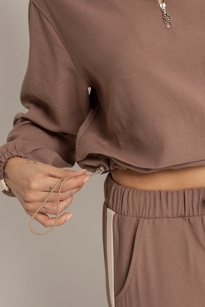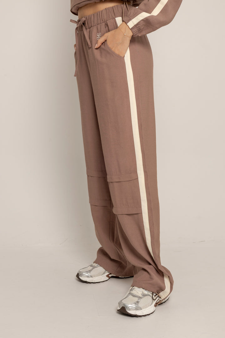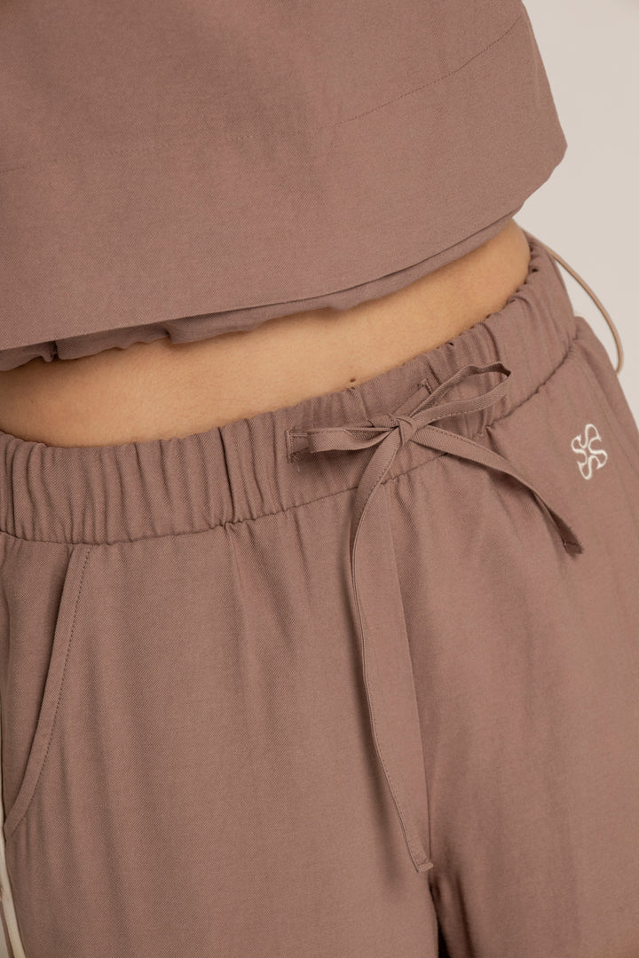 Ambas piezas incluyen líneas laterales en contraste y el logo bordado en el mismo tono, aportando un aire deportivo con enfoque estético. El color tierra suave le da calidez y versatilidad a la prenda, ideal para usar juntas o por separado.