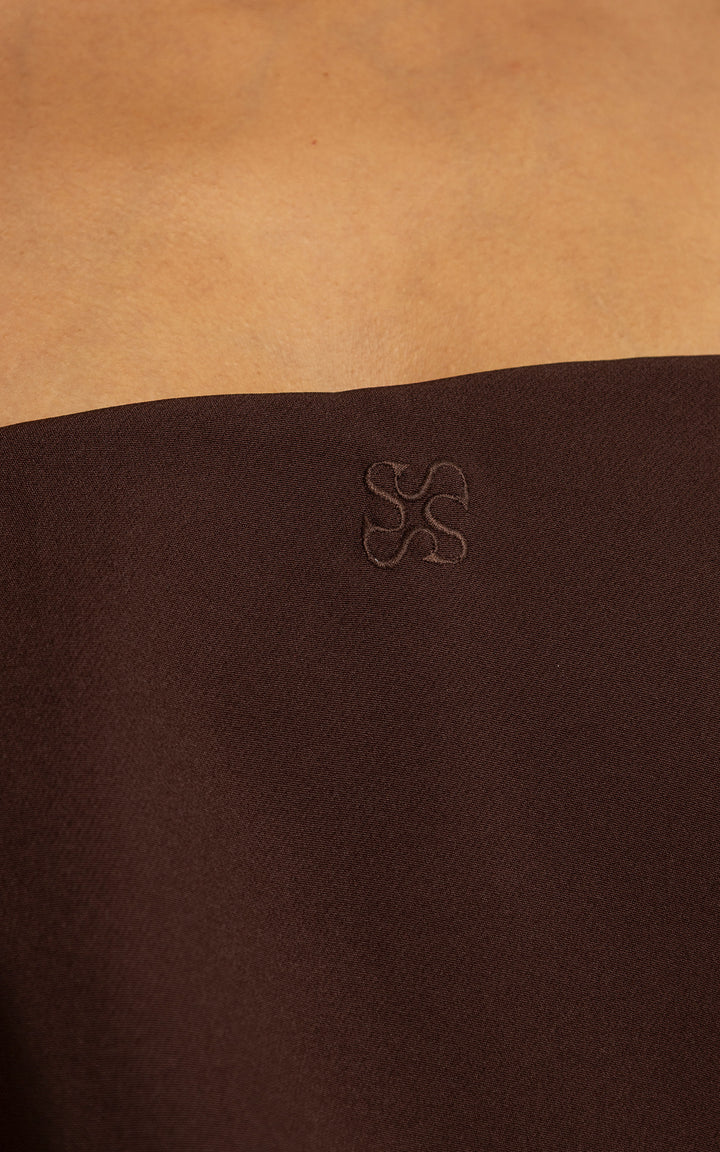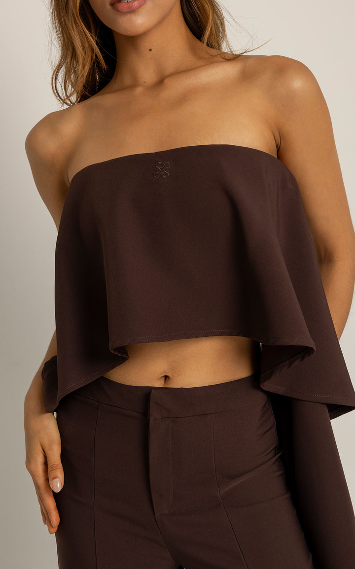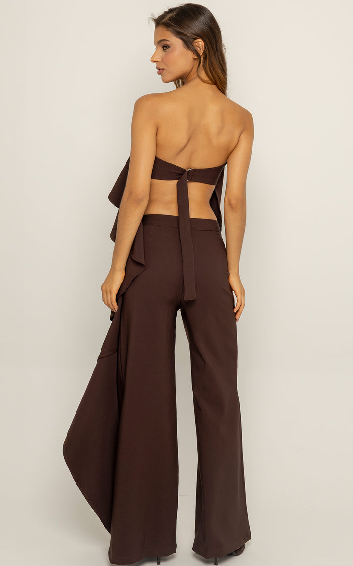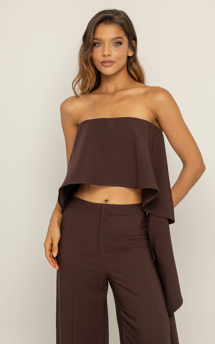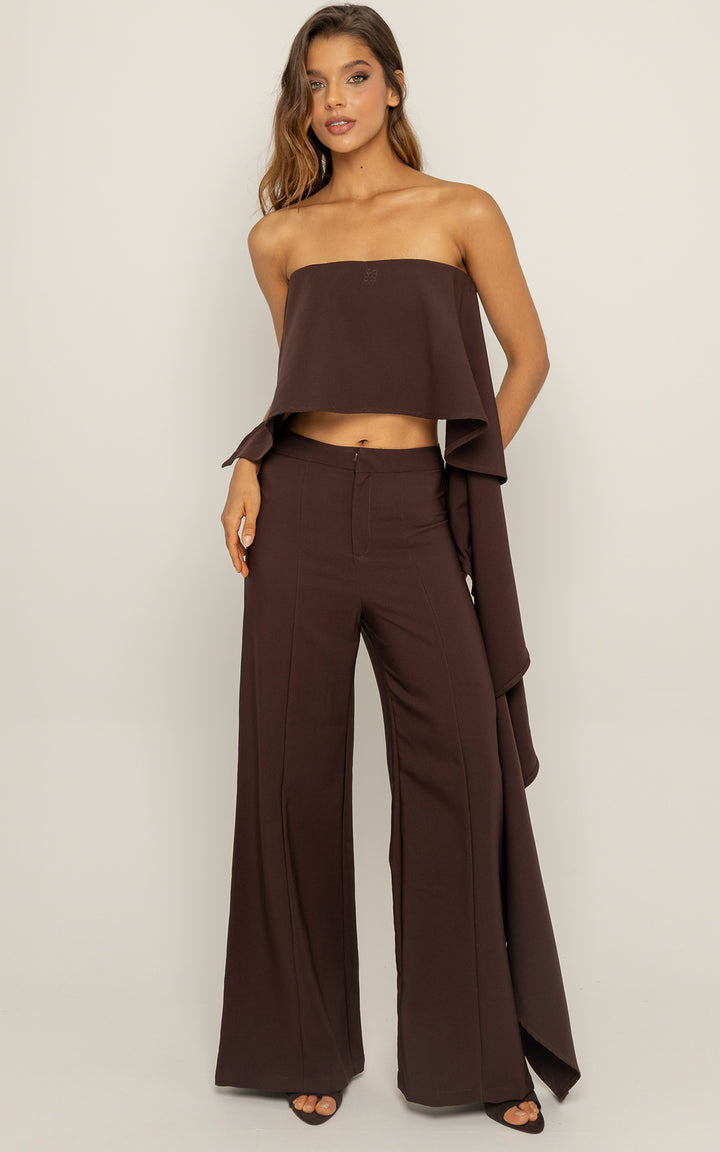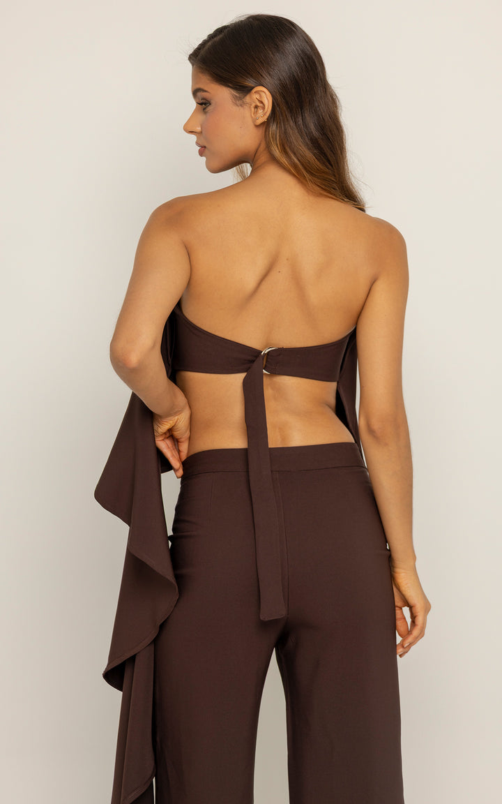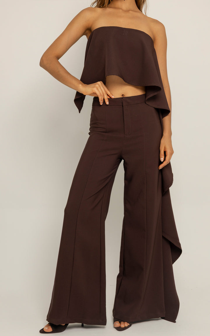 La parte superior tipo bandeau tiene un diseño asimétrico con un gran vuelo que cae en cascada hacia un costado, aportando movimiento y drama a la prenda. El pantalón de tiro alto tiene una silueta recta con una caída fluida y elegante que estiliza la figura. La parte trasera del top incluye tiras gruesas con cierre tipo broche para mayor ajuste y soporte.