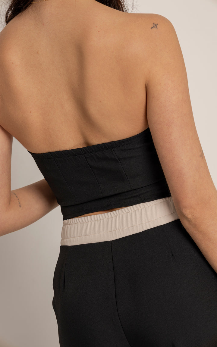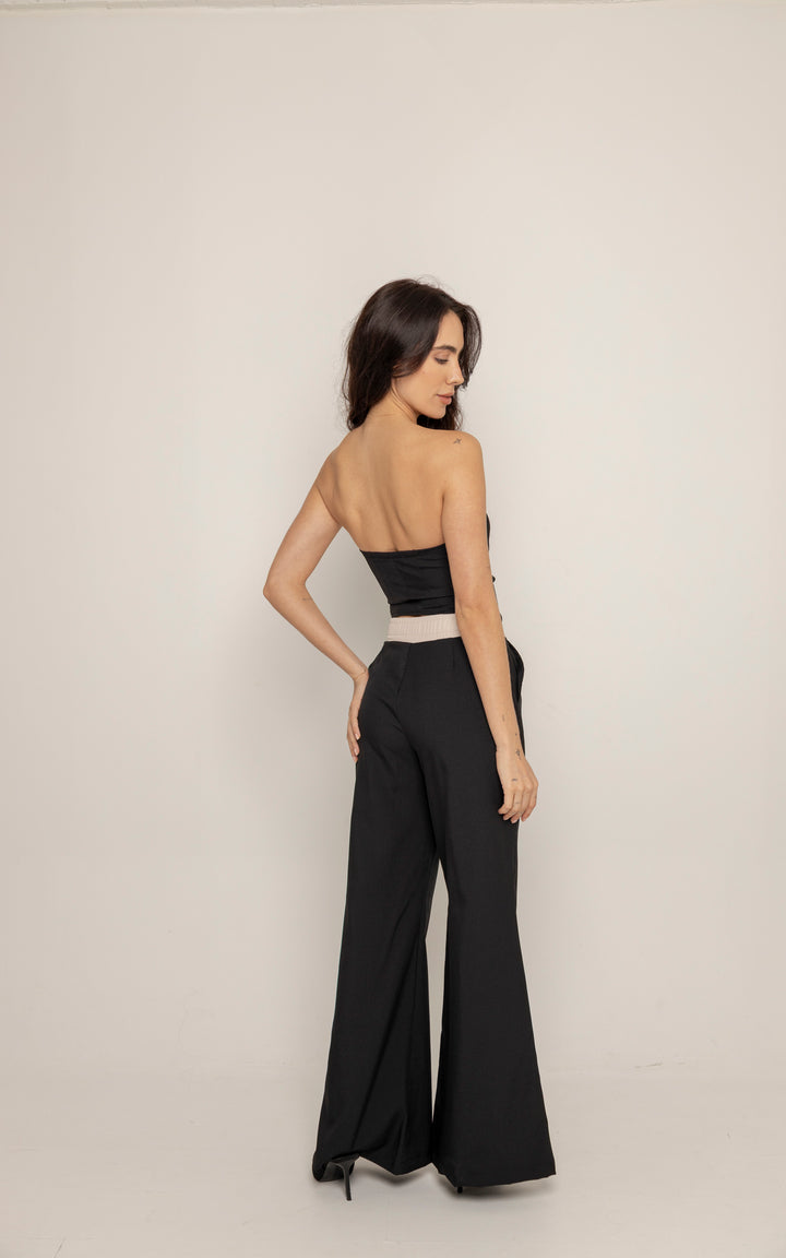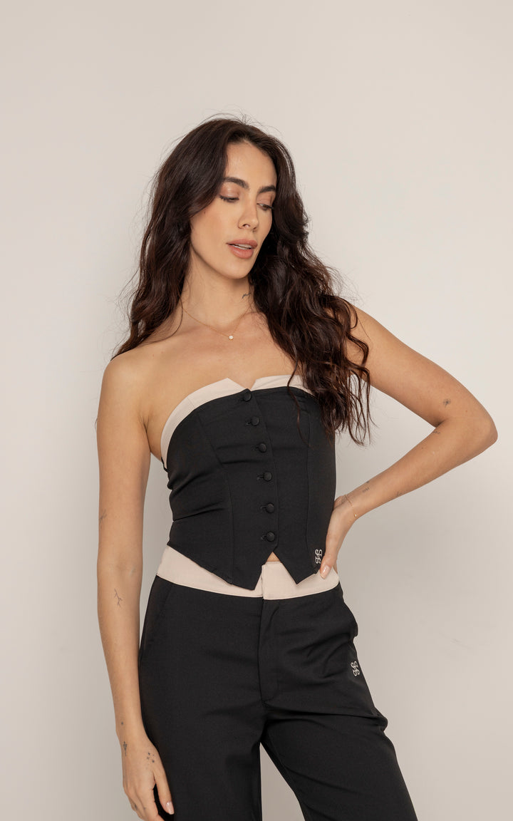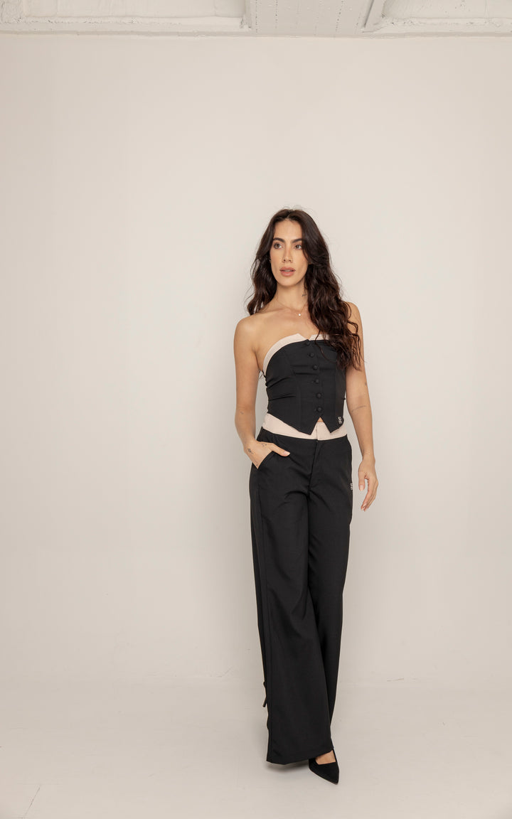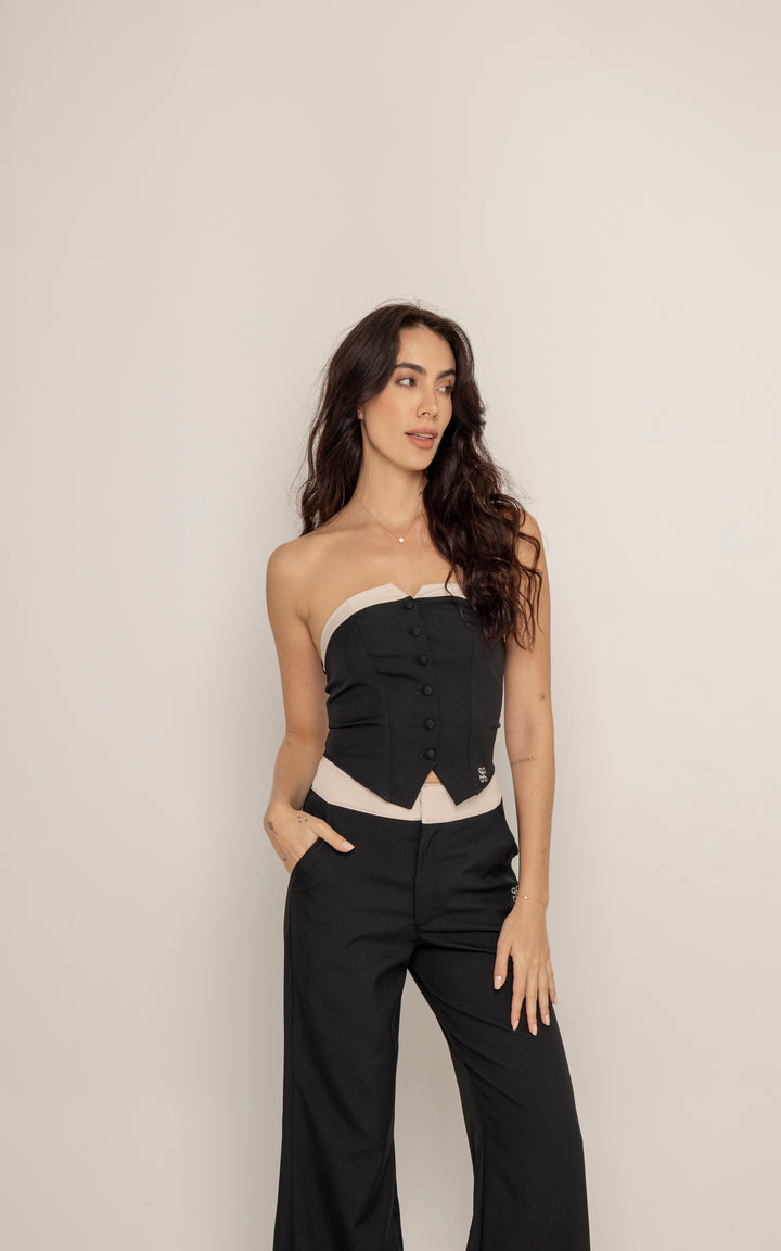 El Set Lily está compuesto por un top tipo corset strapless y un pantalón de tiro alto y bota ancha. El top tiene una estructura tipo chaleco con botones frontales, cortes geométricos que definen el torso y un contraste de color en el escote que aporta frescura visual y realza la forma. El pantalón, por su parte, mantiene una línea limpia con bolsillos laterales y caída fluida que estiliza la figura.