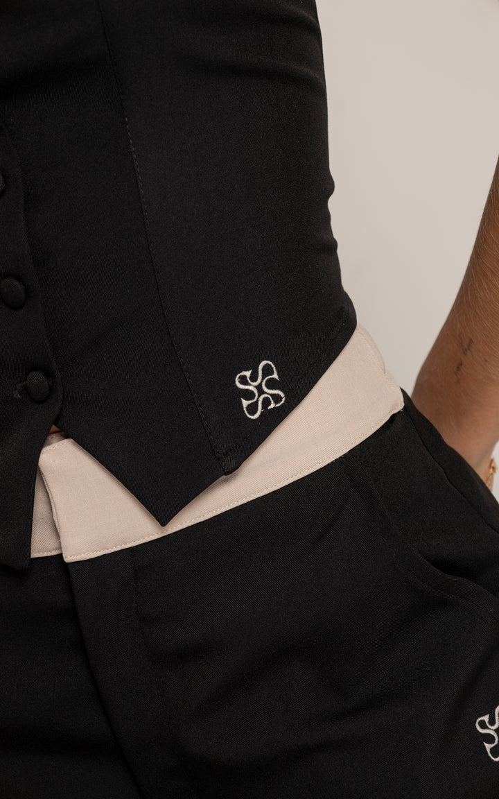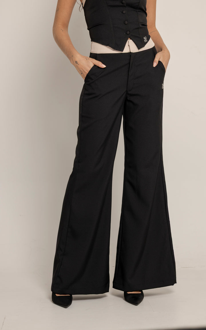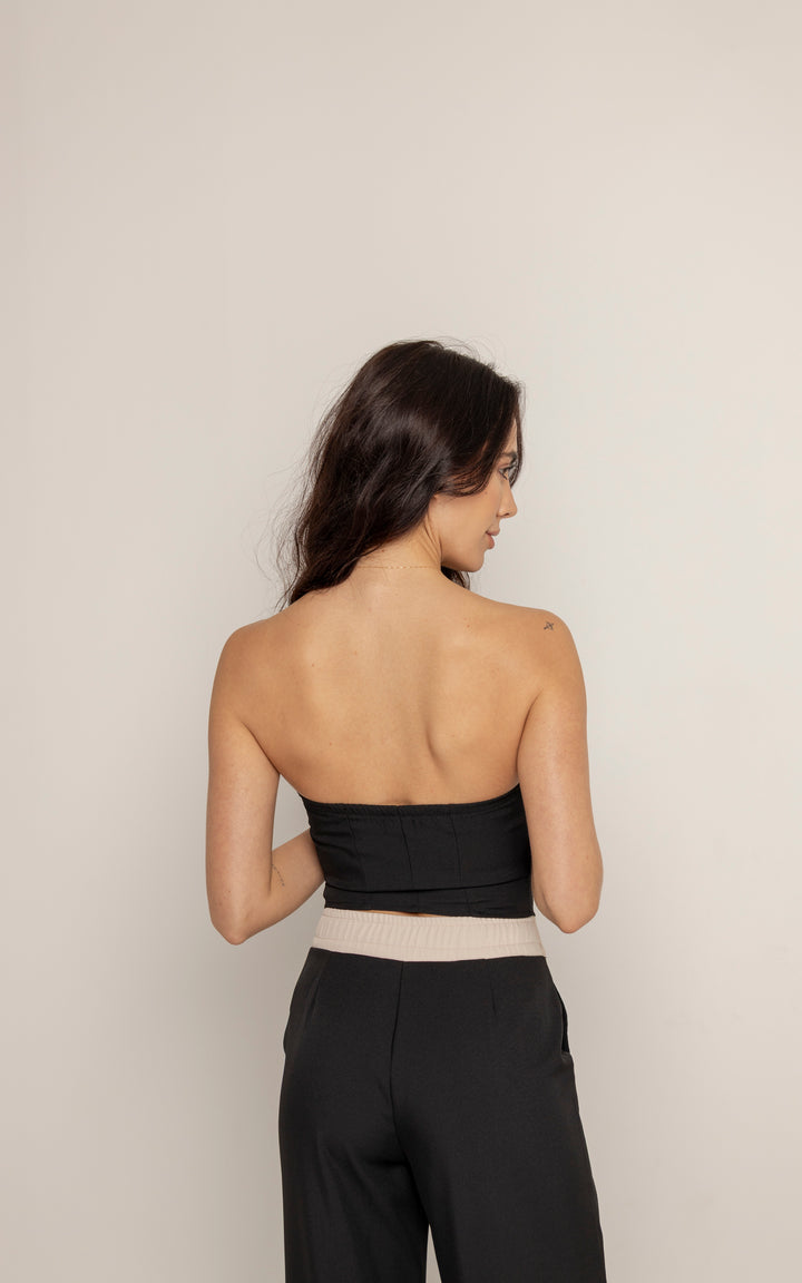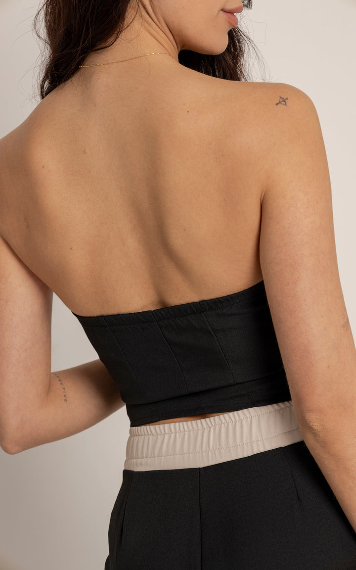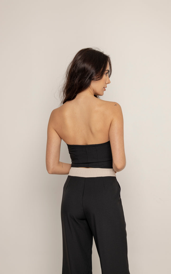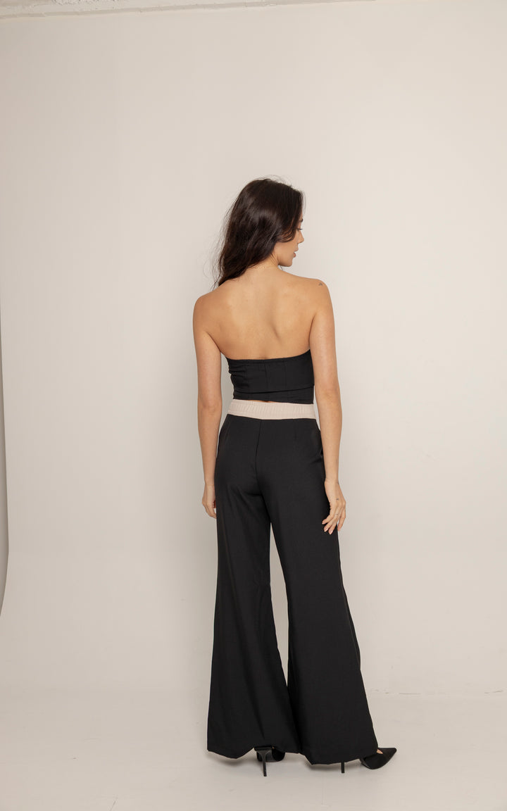 El Set Lily está compuesto por un top tipo corset strapless y un pantalón de tiro alto y bota ancha. El top tiene una estructura tipo chaleco con botones frontales, cortes geométricos que definen el torso y un contraste de color en el escote que aporta frescura visual y realza la forma. El pantalón, por su parte, mantiene una línea limpia con bolsillos laterales y caída fluida que estiliza la figura.