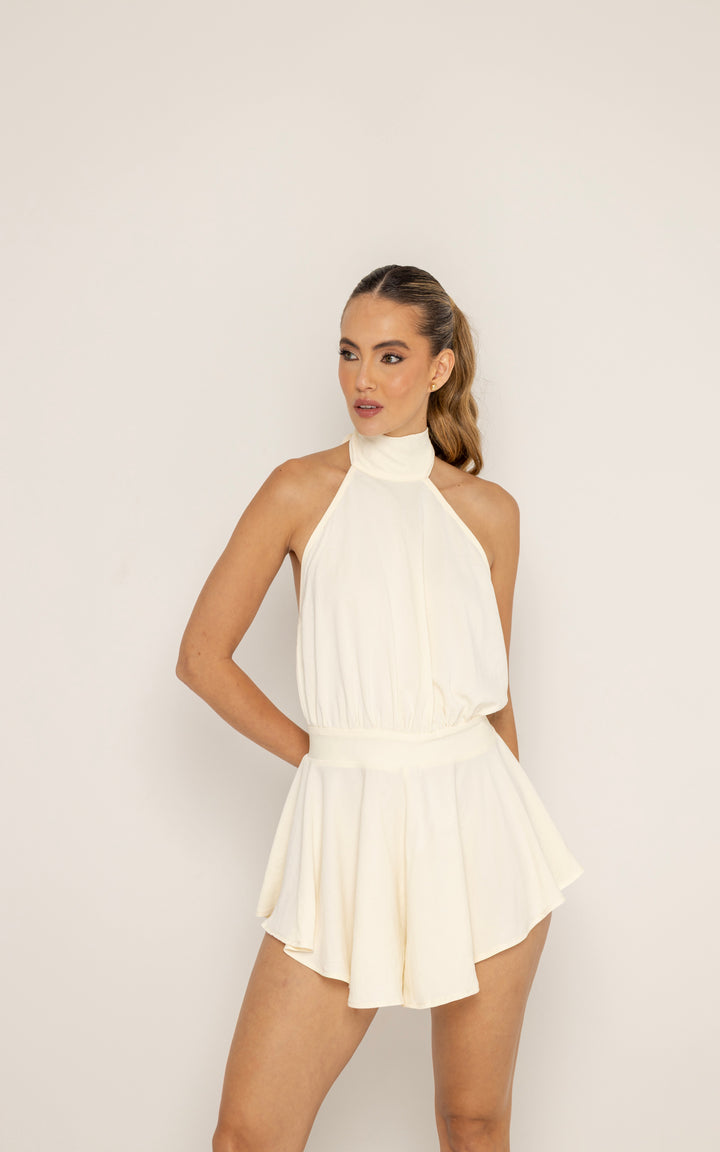 El Vestido Cosmos está confeccionado en una tela fluida y liviana que aporta movimiento y frescura. Su diseño tipo halter con cuello alto y espalda completamente descubierta crea una silueta estilizada y sofisticada, mientras que el cuerpo con efecto faldashort le brinda funcionalidad y seguridad al usarlo.
